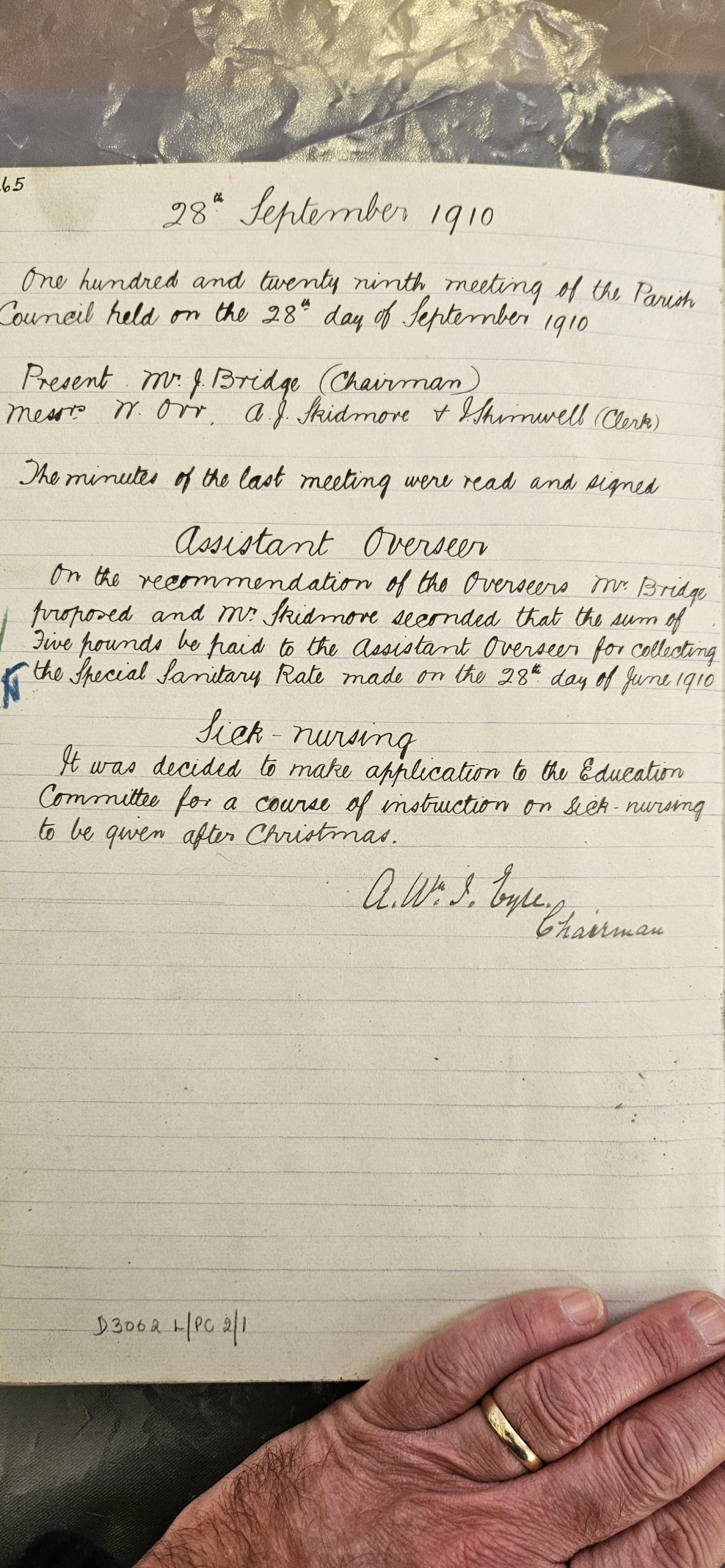 On the recommendation of the Overseers Mr Bridge proposed and Mr Skidmore seconded that the sum of Five pounds be paid to the Assistant Overseer for collecting the Special Sanitary Rate made on the 28th day of June 1910.