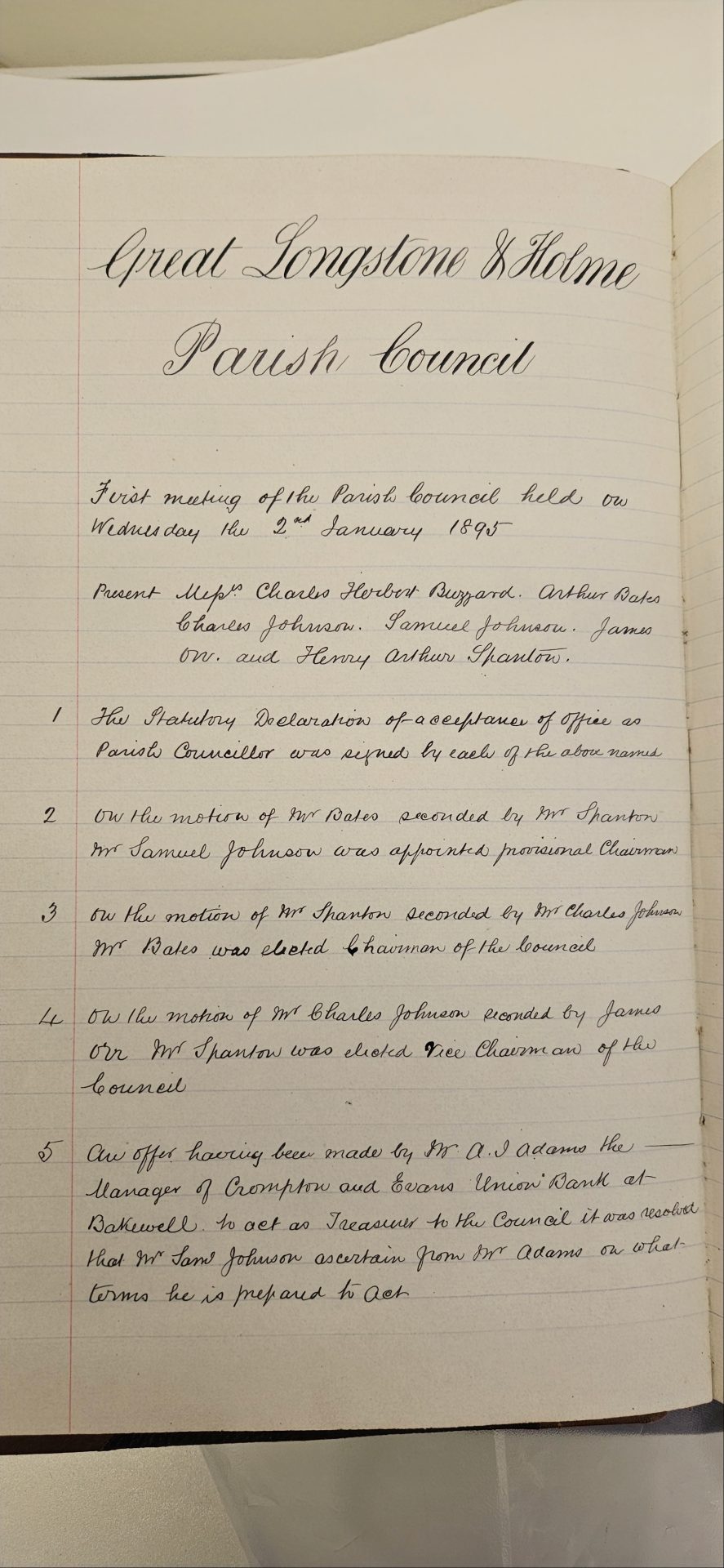 5. An offer having been made by Mr. A. J. Adams, the Manager of Crompton and Evans Union Bank at Bakewell, to act as Treasurer to the Council, it was resolved that Mr. Sam Johnson ascertain from Mr. Adams on what terms he is prepared to act.