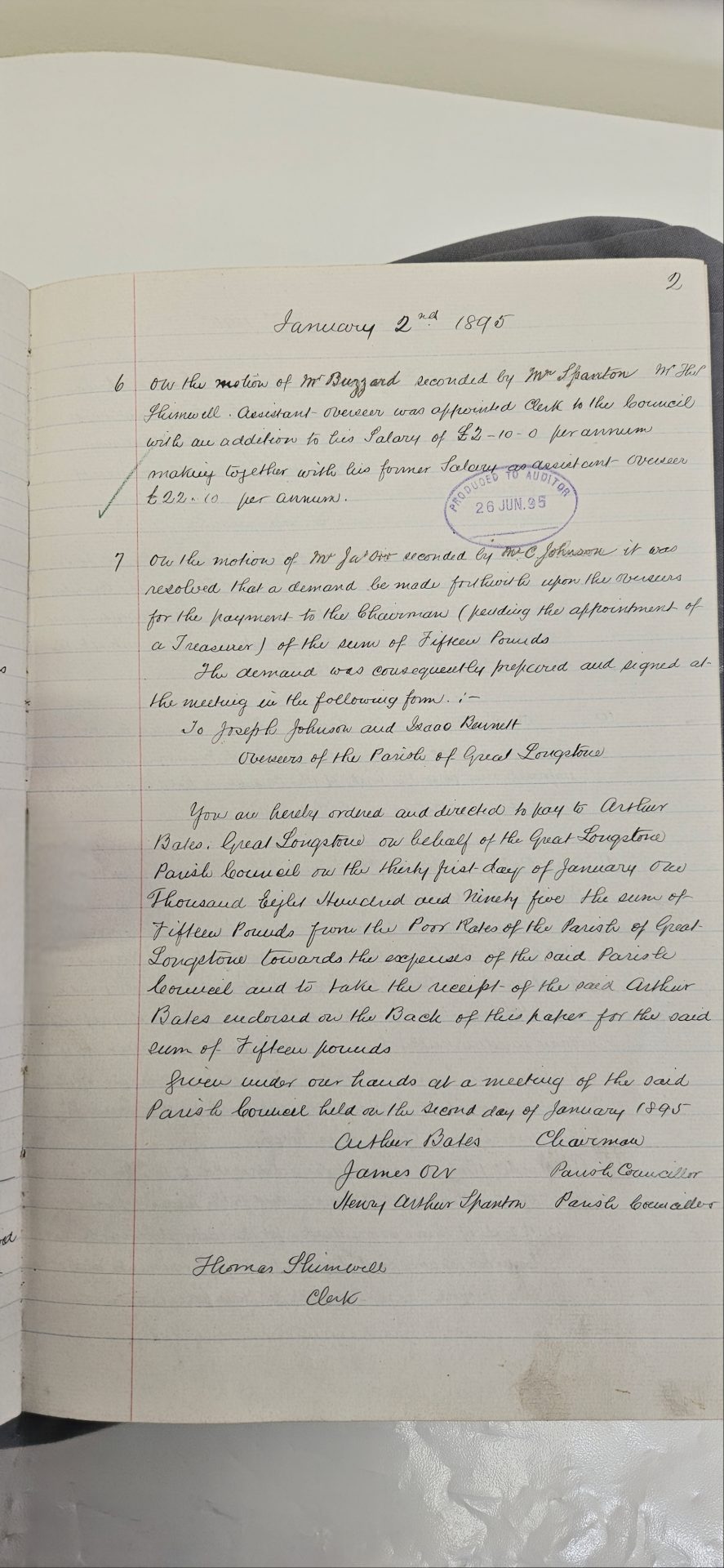 6. On the motion of Mr. Buzzard seconded by Mr. Shenton, Mr. Thomas Shimwell, Assistant Overseer, was appointed Clerk to the Council with an addition to his salary of £2–10–0 per annum, making together with his former salary as Assistant Overseer £22–10 per annum.