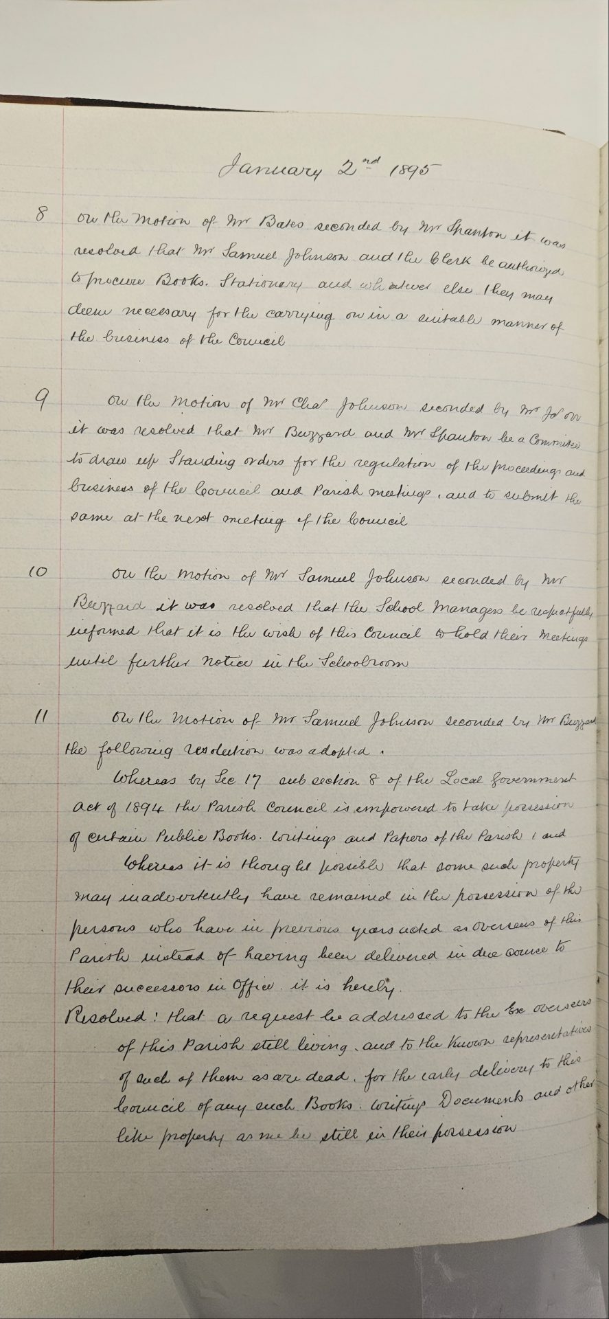 8. On the motion of Mr. Bates seconded by Mr. Shenton, it was resolved that Mr. Samuel Johnson and the Clerk be authorised to procure books, stationery, and whatever else they may deem necessary for the carrying on in a suitable manner of the business of the Council.
