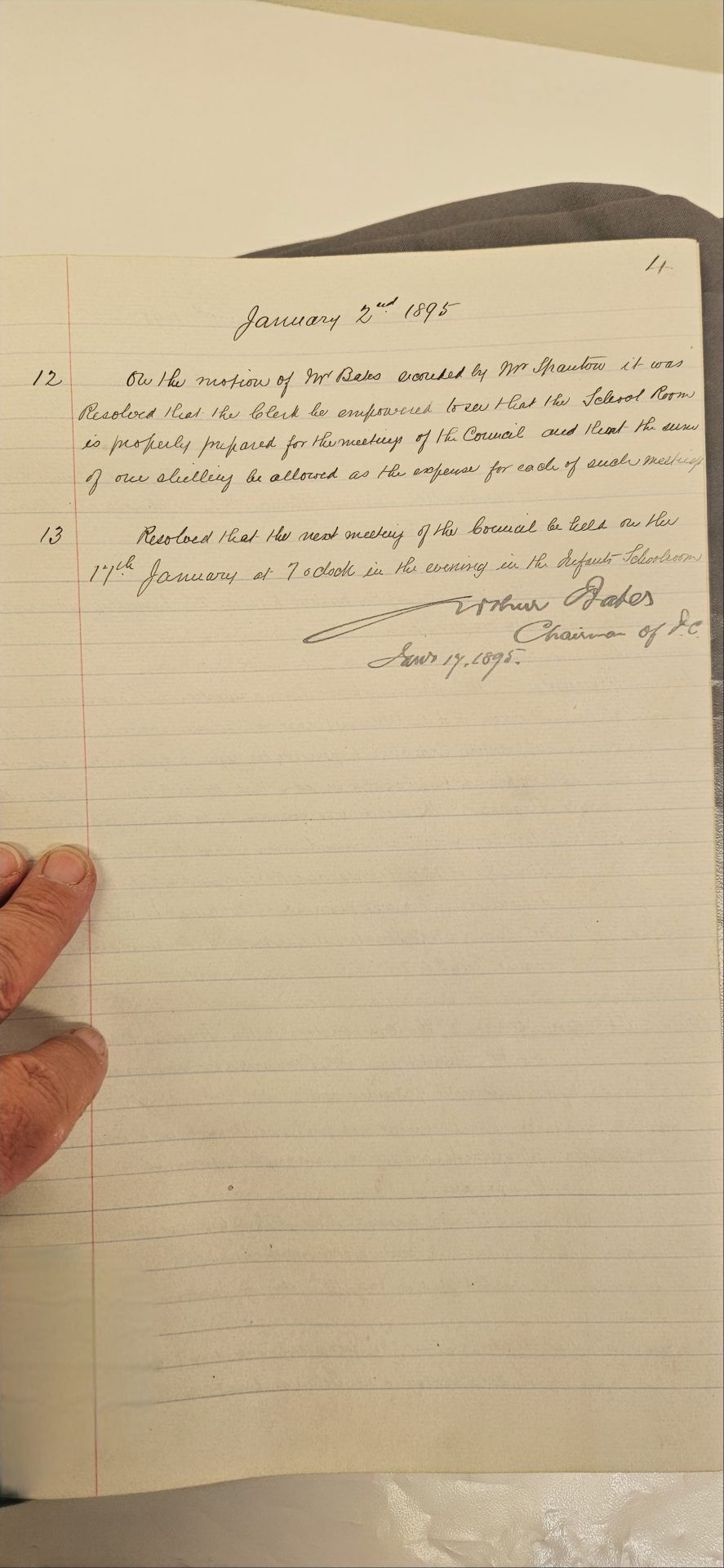 12. On the motion of Mr. Bates seconded by Mr. Shenton, it was resolved that the Clerk be empowered to see that the School Room is properly prepared for the meetings of the Council and that the sum of one shilling be allowed as the expenses for each of such meetings.